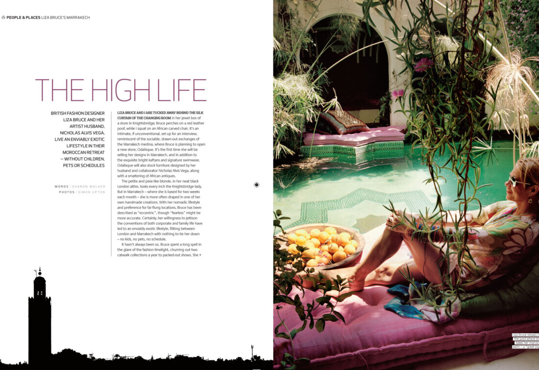 LIZA BRUCE AND I ARE TUCKED AWAY BEHIND THE SILK CURTAIN OF THE CHANGING ROOM in her jewel box of a store in Knightsbridge; Bruce perches on a red leather poof, while I squat on an African carved chair. It’s an intimate, if unconventional, set-up for an interview, reminiscent of the sociable, drawn-out exchanges of the Marrakech medina, where Bruce is planning to open a new store, Odalisque. It’s the first time she will be selling her designs in Marrakech, and in addition to the exquisite bright kaftans and signature swimwear,...